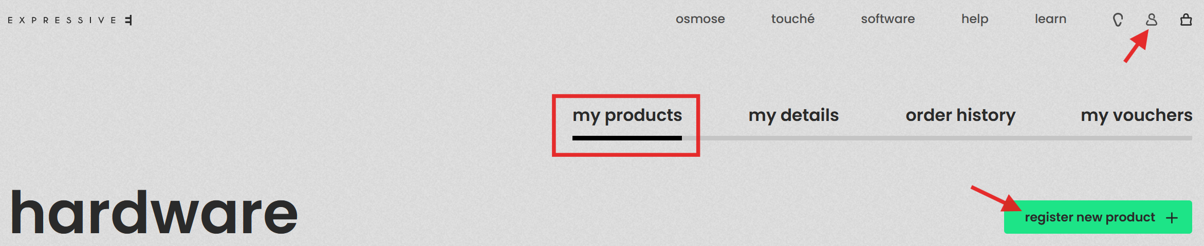 - Once you logged into your account, open the Product registration page: https://www.expressivee.com/register. You will find it by clicking on "register new product" in the "my products" section of your account.