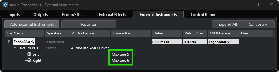 Once the 'External Instrument' and its link to the new Osmose MIDI Device is created, you can set the Device Port of its Return Bus so it matches the audio input of your audio interface that Osmose is hooked up to.