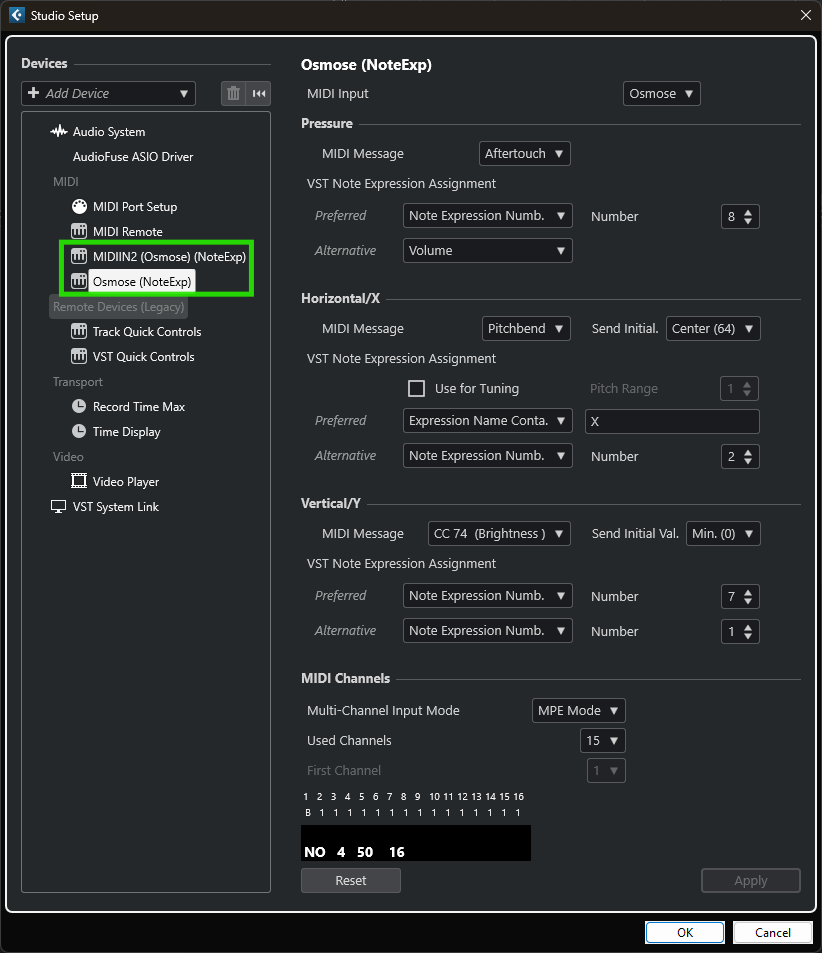If you are on a Windows PC, but the devices don't show up, then it can help to temporarily activate "Use Device 'WinRT MIDI'" in the MIDI Port Setup. You can deactivate the option right afterward, but the Osmose Note Expression devices should still remain added.