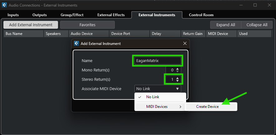 Go to Studio -> Audio Connections and open the 'External Instruments' tab. Click on 'Add External Instrument', enter a name (e.g. "EaganMatrix" or "Osmose"), be sure that a stereo return is set, and click on "No Link" next to "Associate MIDI Device" to choose "MIDI Devices" -> "Create Device".