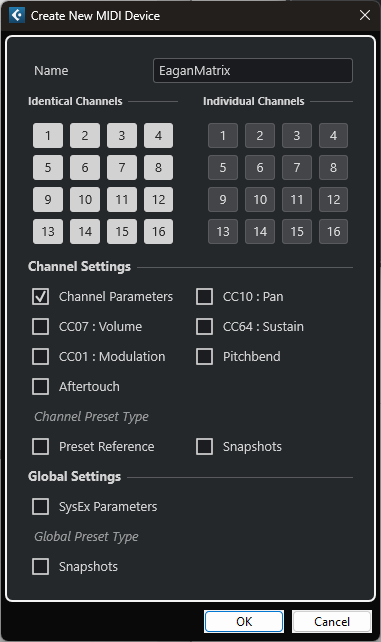 In the Create New MIDI Device panel, simply define a name like Osmose or EaganMatrix. The rest can be left at the default settings.