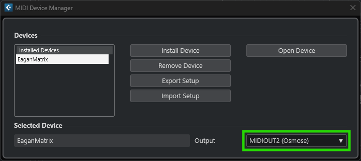 MIDI Device Manager will show after clicking OK. Select "Osmose Port 2" as Output for the MIDI device.