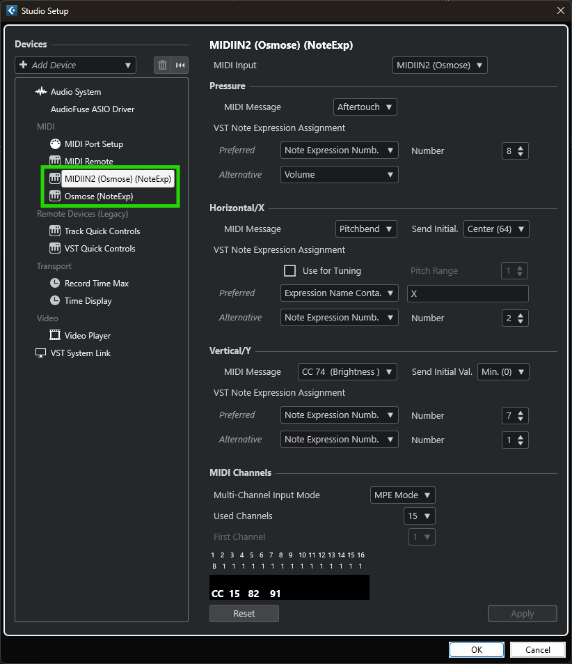 For older versions of Cubase, the Note Expression Device needs to be created manually by clicking on the + symbol. It has to be a Note Expression Input Device that is different from the one you use to control your plugins. For the newly created Note Expression Input Device, set "Osmose Port 2" as 'MIDI Input' and configure the device as shown in the screenshot further above.