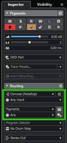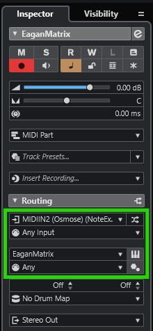 In the Track Inspector, select the Note Expression Input Device that has "Osmose Port 2" chosen for its MIDI input. Set the MIDI channel selection to "Any". The Osmose / EaganMatrix MIDI device should already be selected for the output destination.