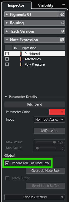 Further down in the Inspector, in the section 'Note Expression', activate 'Record MIDI as Note Exp.'