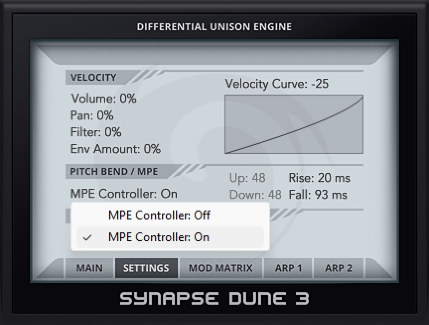 When recalling patches of the Dune 3 Expressive Suite, MPE will be automatically activated within Dune 3. You can verify this in the SETTINGS of Dune 3: