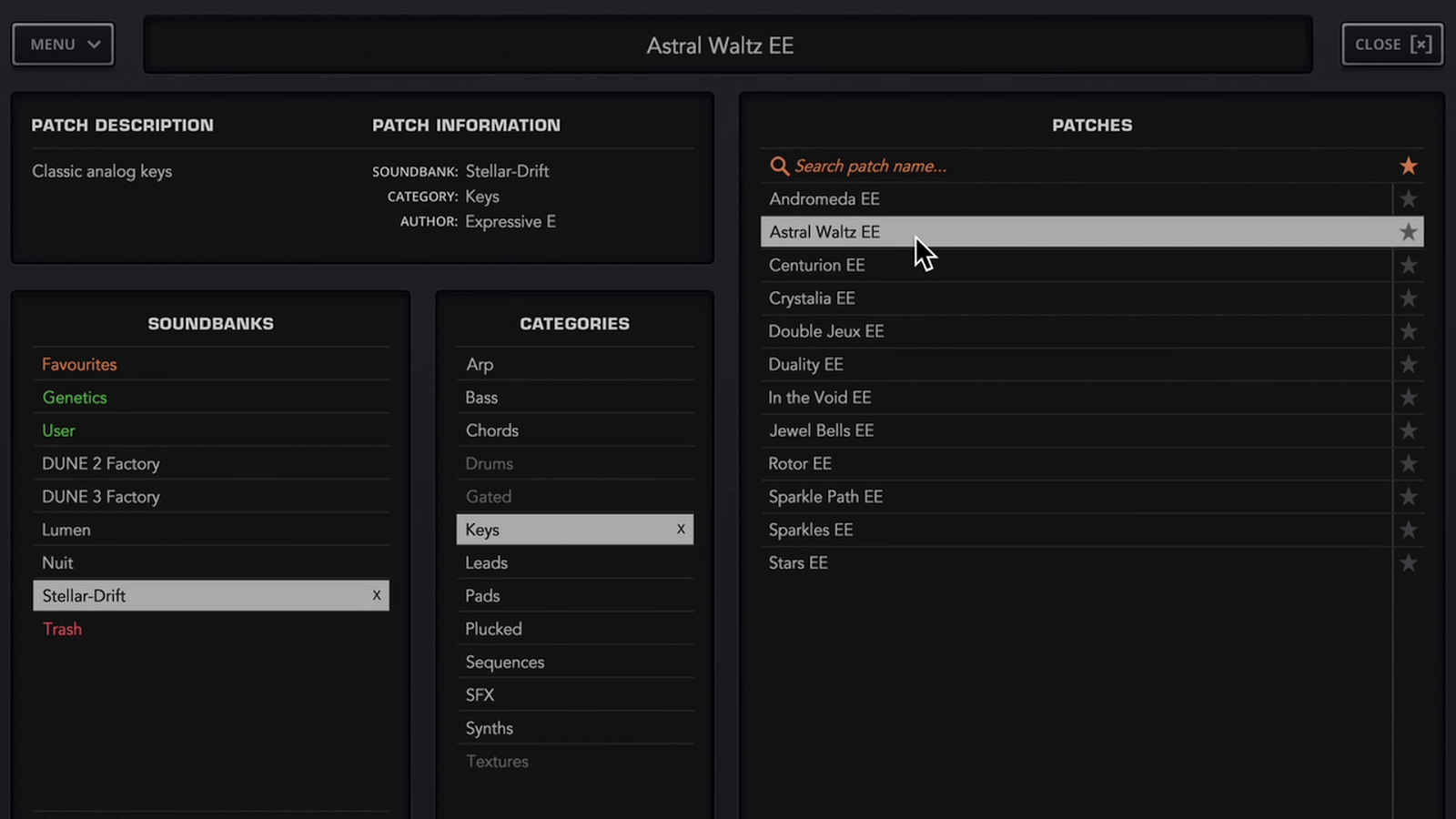 Open the Patches browser of Dune 3 by clicking BROWSE in the virtual display of Dune 3. You will find your new sounds Stellar Drift / Nuit / Lumen in the SOUNDBANKS panel. Click on a soundbank, then click on a patch to play with it.
